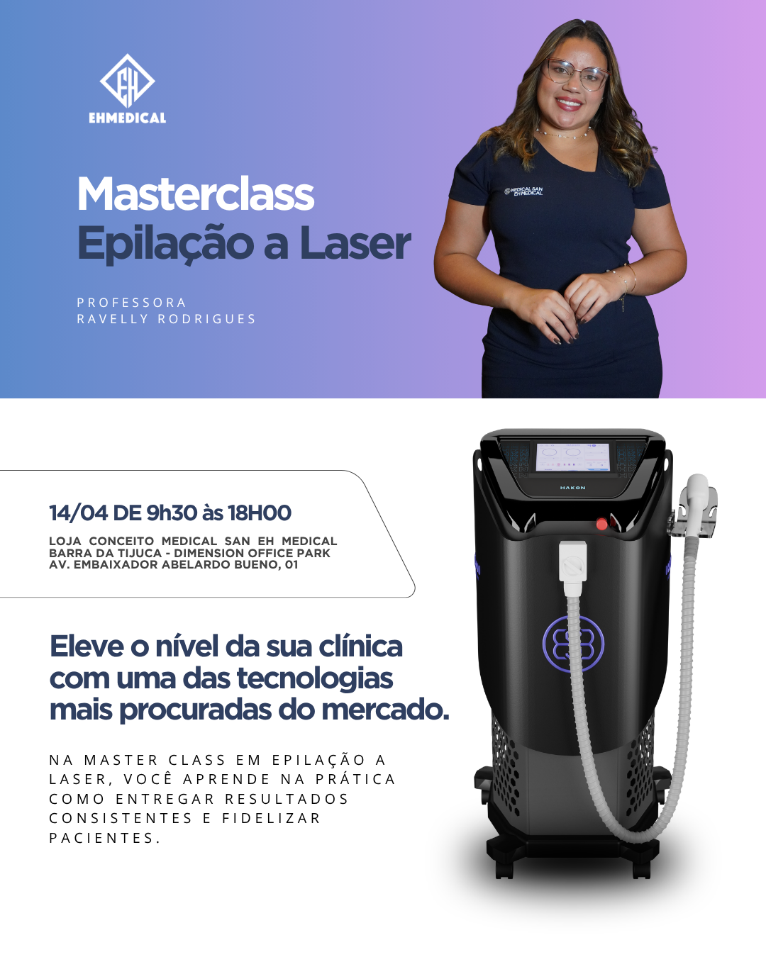 No dia 14 de MAIO, realizaremos uma Masterclass exclusiva sobre Epilação a Laser com a tecnologia Hakon da Medical San — um equipamento de alta performance desenvolvido para entregar resultados superiores com segurança e conforto.