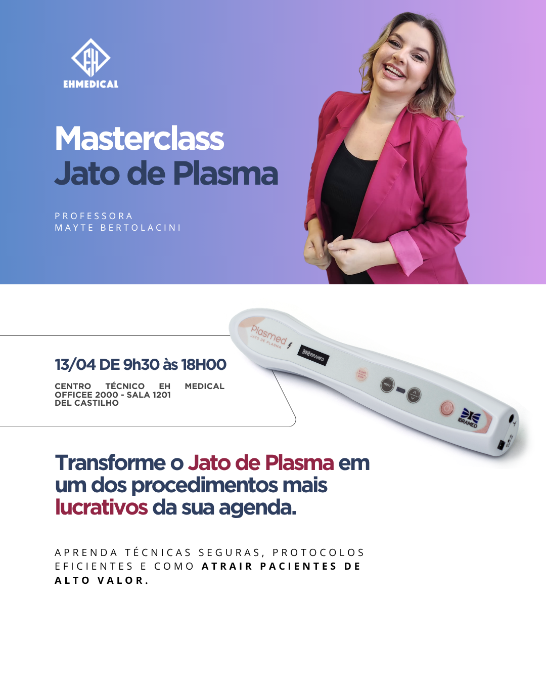 No dia 13 de Abril, você terá a oportunidade de participar de uma Masterclass exclusiva de Jato de Plasma, ministrada pela especialista Maytê Bertolacini — um treinamento completo para quem deseja dominar uma das técnicas mais valorizadas do mercado estético.